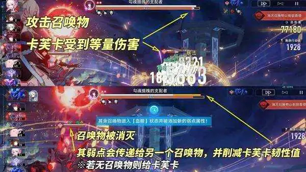 召唤物被消灭时,头顶属性弱点会传递给另一个召唤物,若场上已无召唤物,则属性弱点会回到卡芙卡身上,此时需集中火力尽快将其击破,触发本期效果(激活终结技、恢复战技点)。