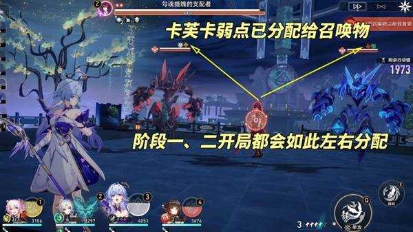 敌人属性弱点「物理、火、风、虚数」,每个阶段开始时卡芙卡会将自身弱点分配给两侧的精英召唤物,左侧物理虚数、右侧火风。
