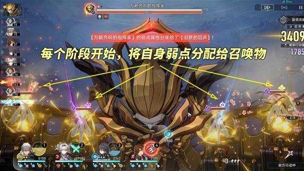 敌人属性弱点「火、雷、量子、虚数」,神主日会按从左到右顺序给4个召唤物分别分配1个属性弱点,任意召唤物被击破时都会将弱点共享给全体敌人,并额外削减神主日韧性值。