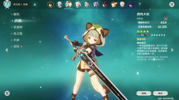 祭礼大剑90级属性为565基础攻击力,30.6元素充能效率。这把武器保证循环方面也不错,但是早柚释放元素战技需要风风轮舞触发祭礼大剑效果,操作繁琐。但也可以作为早柚毕业武器,不过如果有西风大剑依旧选择西风大剑。