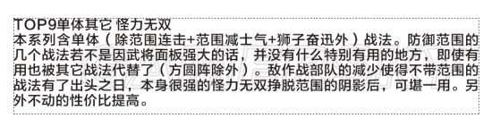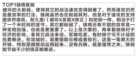 第二个大改动在于削弱了破坏,这次的削弱十分明显,似乎还加了拥挤,变相加强了骁骑,对同是连击的豆类战法没有什么影响意义。再就是鼓励使用兵器,这里加了一个经济限制,我原来钱除了上兵装就是买军娘了。现在电脑这么玩,导致打下来的城有兵无粮,又要买兵粮。