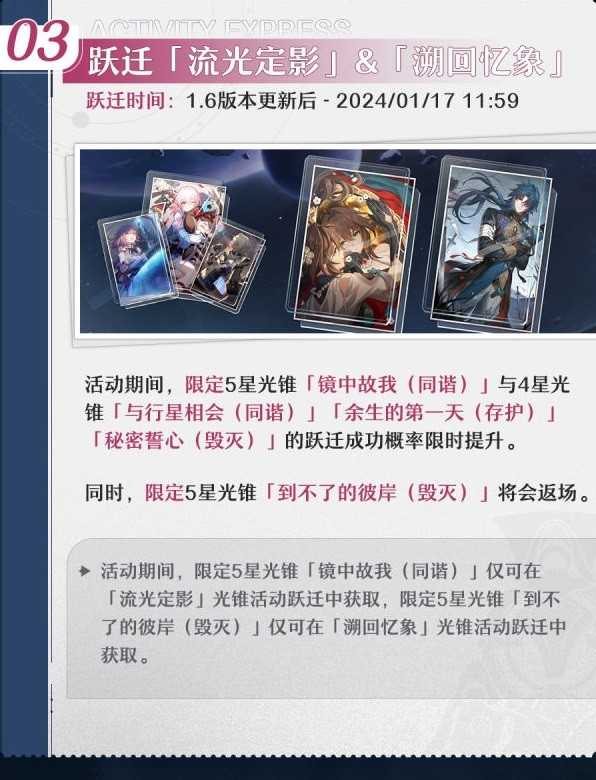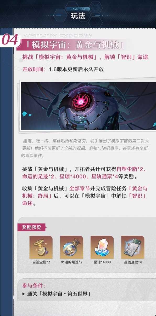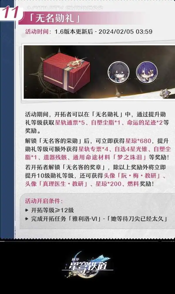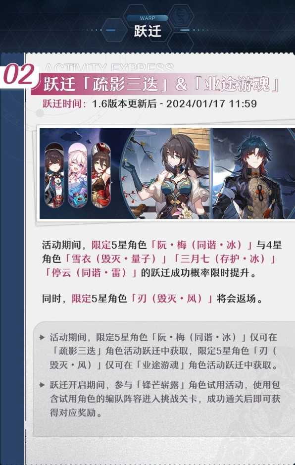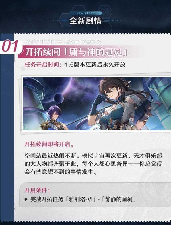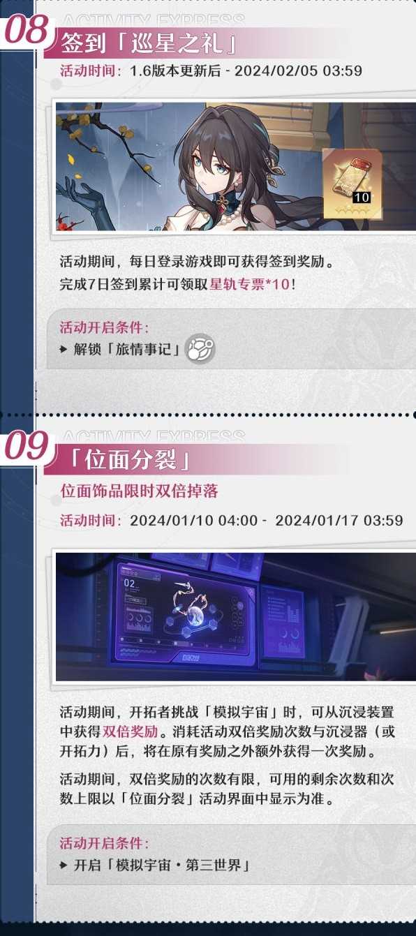 正文 2025年《崩坏星穹铁道》1.6版本上半活动一览「必看」 游戏小达人 /2025-01-02 08:27:56 /53 浏览量 0102 《崩坏星穹铁道》1.6版本上半有多个活动开启,想要知道更新后可以体验哪些内容的玩家请看下面“崩坏星穹铁道”带来的《崩坏星穹铁道》1.6版本上半活动一览,希望能够帮助大家。 -- 展开阅读全文 --