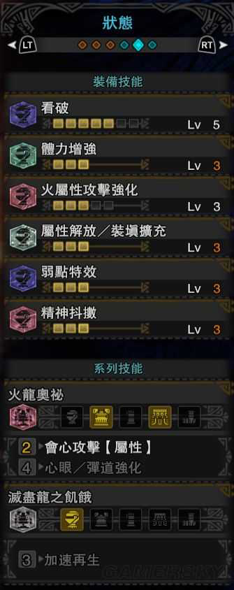 属性轻弩的配装较为简单,主要是以精神抖擞和弱点特效为核心出出满会心,再配上火龙二件套的属性会心效果增加伤害,辅以属性解放增加装填量,虽然看起来核心技能比较多,但都很好配出来
