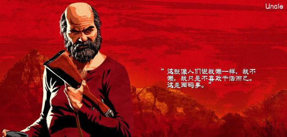 帮派的第二员老将,平时就是好吃懒做,嘴还臭,约翰后期买农场,正常人都得恭喜吧,大叔却一个劲埋汰这什么破玩意垃圾堆都比这强。虽然话里的意思是这地方该重建一下更好,我可以勉强帮你一下,但是说出来的就太难听了,诸如此类,谁都不待见,不过他的资历还是非常老的,要不是性格太洒脱太豁达说白了就是懒,他也能成为帮派的核心成员,而不像游戏里,经常在酒吧门口看到他要被揍,在帮派里跟个要饭的似的,谁都不尊敬他,约翰对他老婆评价大叔我感觉很中肯,大叔这个人很有用,但是你使唤不动他。不过不管怎么样不尊敬他,他也是帮派的一份子 是家人,1代结局中枪也是让人唏嘘不已。