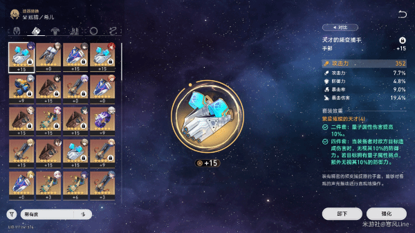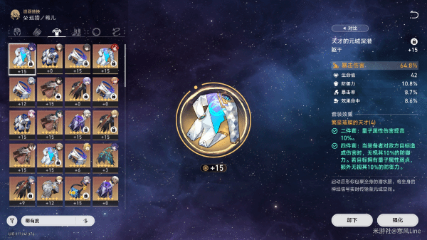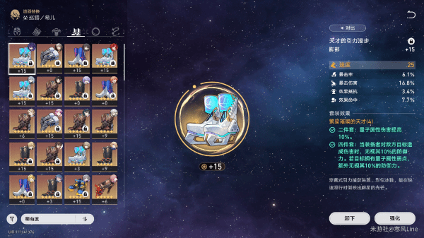 配备量子4件套+萨尔2件套,银狼在第一次上的时候已经满星魂,做一个副C使用,6星魂的它在命中上大大降低了要求,但是在配速、暴击率、爆伤之间的平衡性是最难的,一件装备的属性要求上至少是3个,优点是量子套泛用性强,有多少小伙伴跟我一样还在乐此不疲的刷刷量子套。