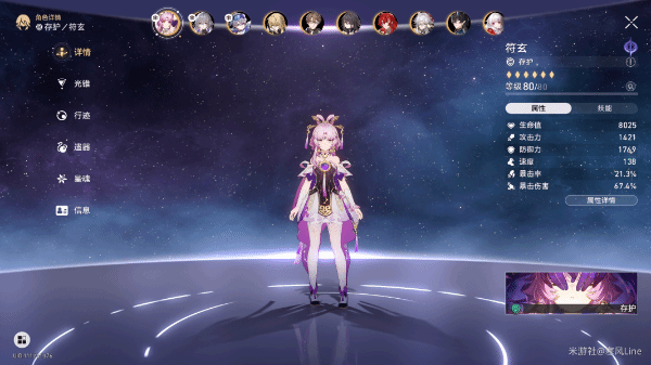 符玄:生命8025、防御1769、能量恢复131.4%,速度138、抗性49.3%