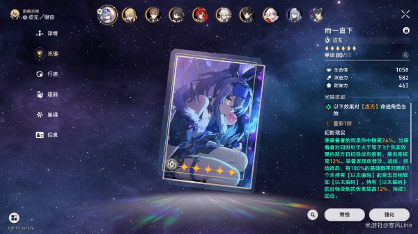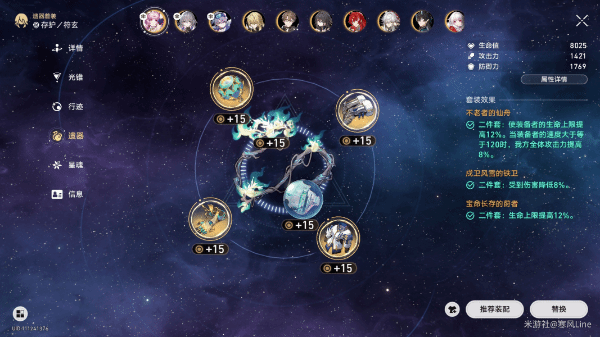 配备铁卫2件套+长存2件套+仙舟2件套,速度鞋、能量球,副词条堆抵抗、防御、词条,遗憾的是抽完符玄没怎么完,抽了一把星魂没出就错过了,只能等下次复刻补1命。