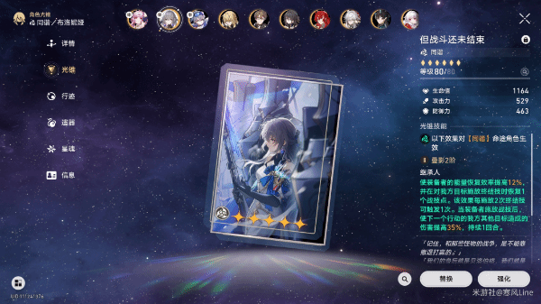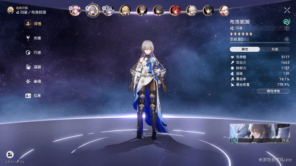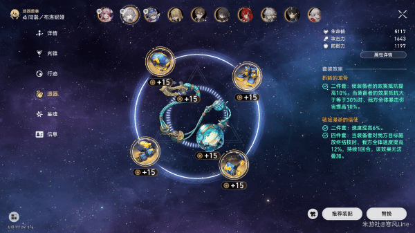 配备信使4件套+龙骨2件套+仙舟2件套,速度鞋、能量球,副词条堆,布洛妮娅没什么好说的,配速一直是一个非常纠结的问题,不断尝试与更新中,作为初始角色,满星魂了,泛用性已经拉的满满了,虽然同谐出了一个又几个,能有6星魂的有几人,虽然0星魂即是完全体,谁又会嫌6星魂香呢。