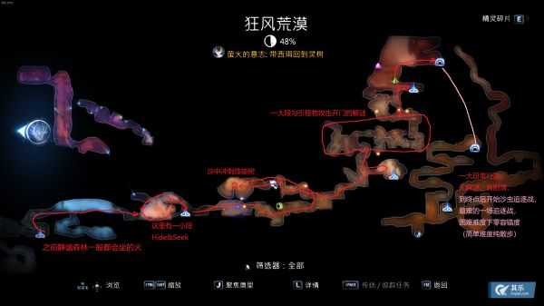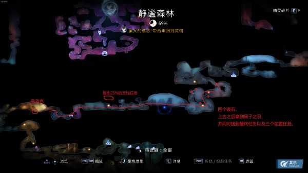 3、游戏速通主线,理论上可以全程不购买不用碎片以及忽略所有非主线收集要素,本指南推荐收集一颗格勒克碎片,用以解锁泉源林地的精灵之井(也就方便回家找狐狸确认自己死没死过了)