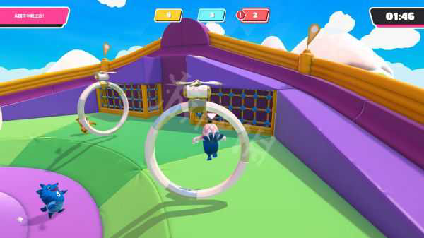 本地图分为八段障碍赛道。跑过三个障碍物后来到第一段推推赛道(也可从弹跳垫上弹上来但存在一定风险),找准时机通过。