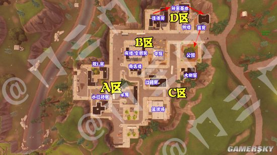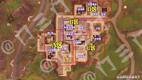 这里我们首先要了解各区内的高点位置A区:小红砖房B区灰楼/空调楼C区红砖房D区钟楼。(后面有用哦!)