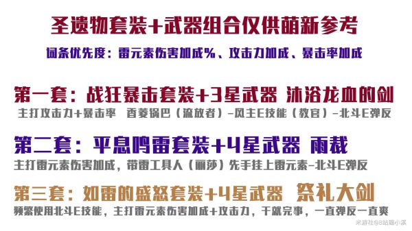 平息鸣雷套装(提高雷元素抗性与对被雷元素影响的敌人的伤害)+4星武器-雨裁(强烈推荐精炼5的3星武器龙血剑,就可以带上安柏全队增加20%攻击力,按照其他套装一样打连招)(对处于水元素或雷元素影响下的敌人,造成的伤害提高20%/24%/28%/32%/36%)