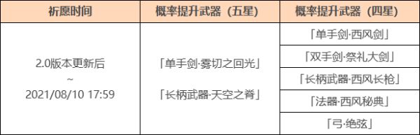 *PS:其中「单手剑·雾切之回光」为限定武器。