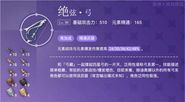装备评价:在元素精通加强之前副词缀弱势的情况下也用超高的B区乘区硬生生提高了自身强度,精通加强之后,满精的绝弦甚至可以在温迪这类剧变反应高频的角色中取代五星武器「天空之翼」的位置。