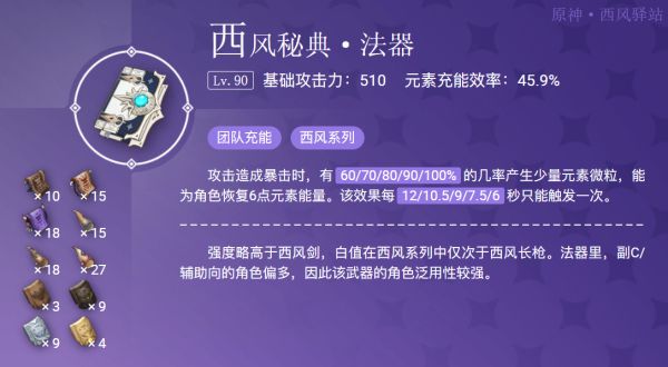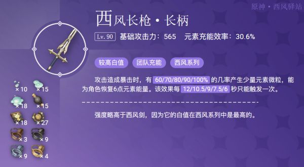 除了胡桃不太依赖元素爆发输出以外,其他角色的元素爆发都较为重要——特别是香菱和魈,从这点来看,“雪山薄荷”的角色通用性其实还是不错的,就是强度不尽如人意,甚至不如纪行武器——「决斗之枪」。不过下版本充能套圣遗物实装,略微提高了元素充能效率的地位(但并不需要刻意堆叠元素充能效率),该武器在香菱身上会更有用武之地。精炼提升中等。