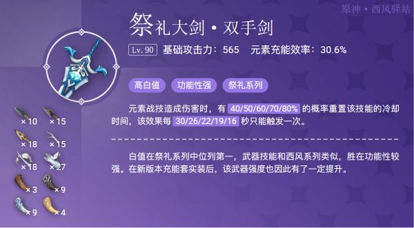 装备评价:在当前版本充能圣遗物开放获得之后,该类武器的地位略有上升,充能套让其副属性对角色伤害也有了一定提升,单手剑适配该武器的角色略少,较缺充能的代表行秋也是佩戴祭礼剑。