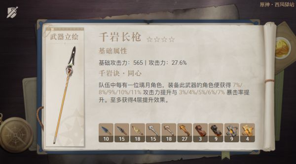装备评价:目前千岩系列武器的特点是副词缀统一为攻击力,武器技能统一为“队伍中每有一位璃月角色,佩戴角色获得攻击力和暴击率提升。最多获得四层提升效果”。每精炼一次,每层攻击力/暴击率提升效果均提高1%。适合队伍中璃月角色≥2名的角色佩戴(一层武器特效实在是不够看)。