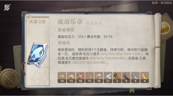 莫娜用该武器打蒸发元素爆发时,随机到任何一个BUFF都可以有加成;精通辅助向砂糖佩戴时,则只有“间奏曲”能提高精通。虽然拥有暴伤副词缀,但该武器的武器特效不够稳定,驻场主C使用时,该武器优先度会较低,当下大部分速切队伍的流程都是以半分钟(30S)为主,流浪乐章荣光不朽。