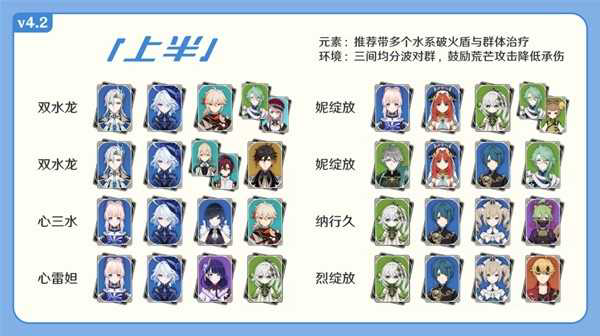 推荐带水系破火盾与群体治疗角色,鼓励使用元素或荒芒攻击瘫痪敌人