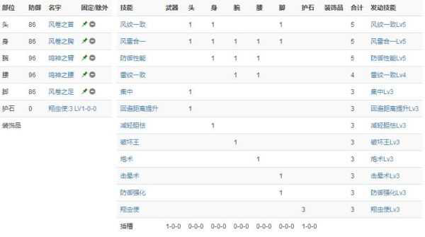 由于开荒时每个人获得的素材不一样,且不同位置提供的技能重叠很多,所以只提供重点关注的套装,不同散件看情况搭配。一路上可以渐渐做出翔虫珠和回距珠的装饰品,做出来就插进装备里。