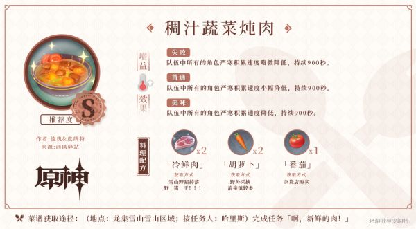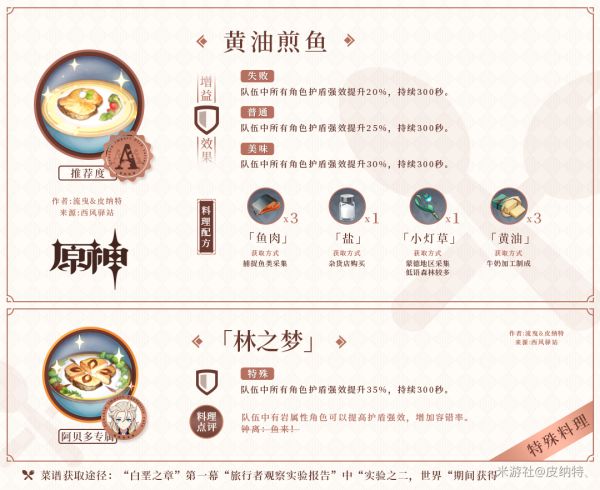 《原神》1.2版本更新了新的区域和其他内容,其中也包括了几个新料理,想要了解这些料理的请看下面“皮纳特、”分享的《原神》1.2版新增食谱效果及获取方法,希望能够帮助大家。