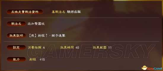 此战法非常厉害,除了添加范围很大的群体连击之外,还增加攻击射程,避免近战挤压。看起来4采配应该是少了。