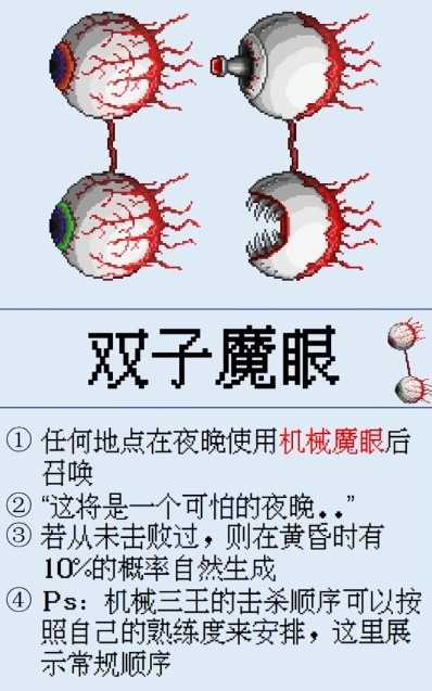 《泰拉瑞亚》肉山后的BOSS强度大幅提高,其中双子魔眼是克苏鲁之眼的强化版本,想要了解召唤方式的玩家请看下面“不过如此太阳”带来的《泰拉瑞亚》双子魔眼召唤方法,希望能够提供帮助。