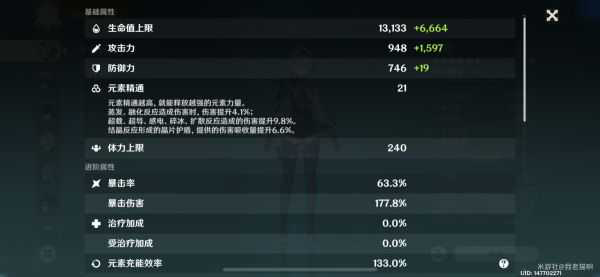 贴上优菈面板,本来是可以使用爆伤头和更好的杯子和花的,考虑到打12-2需要一点点的充能,于是使用的是双爆比较差、拥有一定充能的面板。
