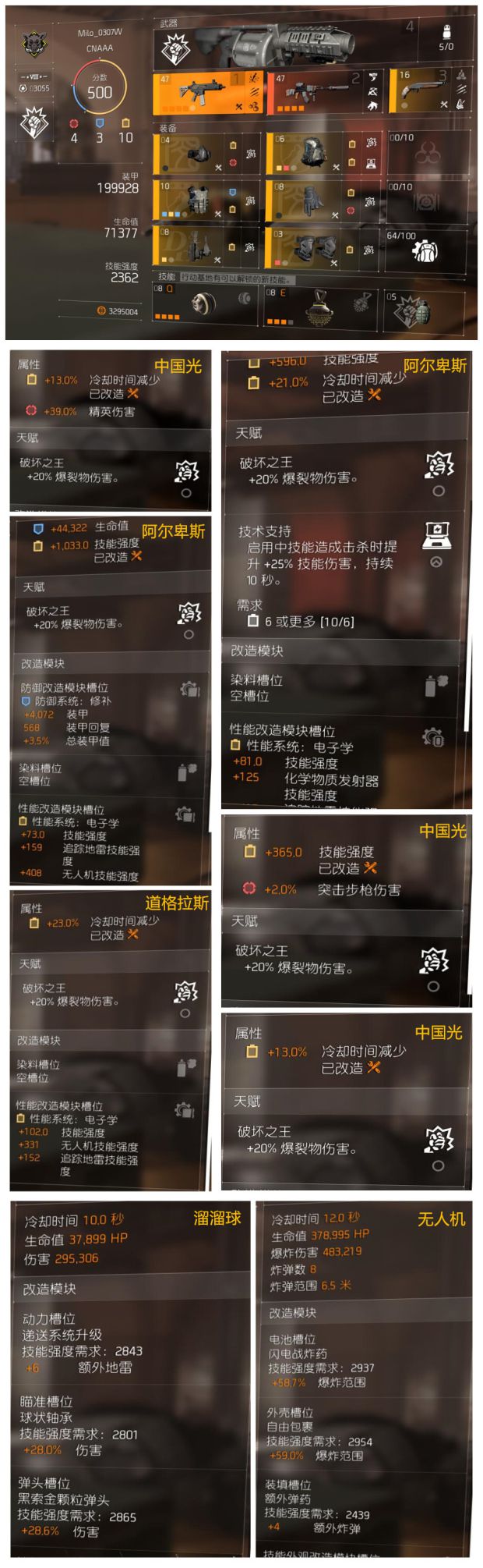 目前面板52精伤,无人机溜溜球3100电力,如果非要说哪里不完美就是胸甲可以换成+25%爆裂物伤害的政令胸甲,政令如果有20+的爆裂物伤害建议用政令,背包换阿尔卑斯的元素包,两个性能插槽,一个插电子学一个插+5%爆裂物,这样整体多了10%的爆裂物伤害,应该是最完美的电工了。