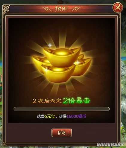 英雄,只要消耗少量元宝,就能通过招财换取大量银币哦,运气好还能多倍,最高多少倍我不知道,反正我是出过10倍暴击,银币哗啦啦地从天上掉下来~