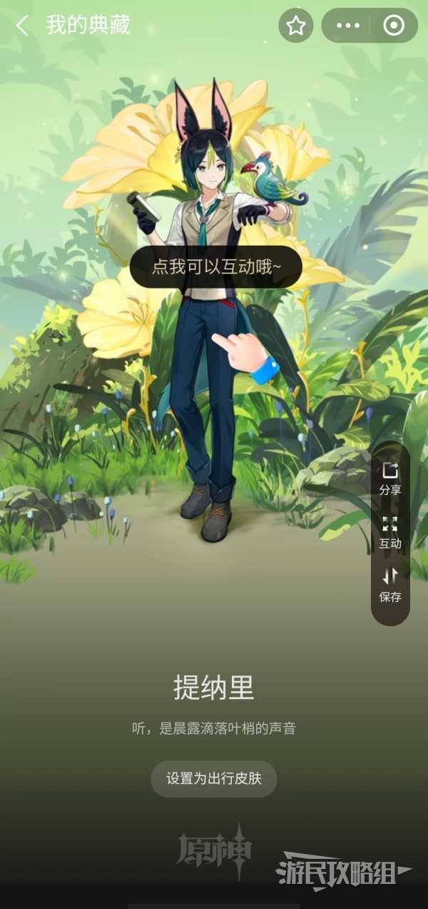 提纳里互动,听完语音即可自动抽奖。每天仅首次互动可以抽奖,每天可以抽3次(三套皮肤)。