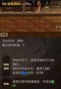 受身蹲伏在被对手击倒后可以使用,倒地状态下按住该技能不放可以在短暂时间里处于下蹲无敌状态,躲避对手的后续技能,配合使用疾闪能够快速拉开安全距离。