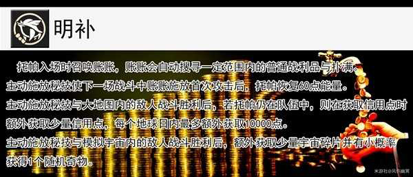 ·我方托帕&账账以外的角色释放追加攻击命中被战技debuff标记的敌人时,可以让账账更快的出击攻击敌人,但账账自身的追加攻击无法拉条。