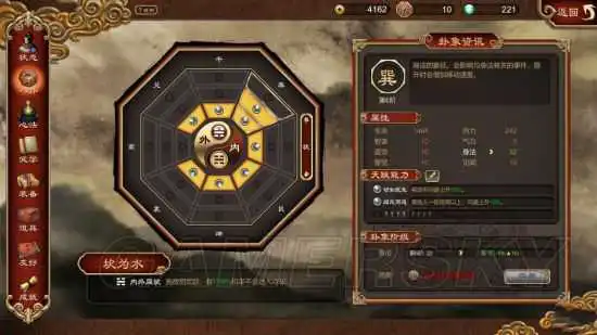 心法可以直接增强角色的各项属性,并且运行效果也非常多样,玩家可以根据自己的战斗风格来调整最适合自己的心法。而八卦在游戏占据的地位已经超出了战斗的范畴,游戏没有等级系统,所以很多情况下决定玩家能否进行任务的关键就是八卦点数,升级八卦属性除了直观增加战斗力外还对剧情有着很大影响。比如玩家需要动用内力开锁时坤字挂的高低就成为判定的标准,如果判定失败可能就需要再去修炼或者直接影响后面的剧情了。
