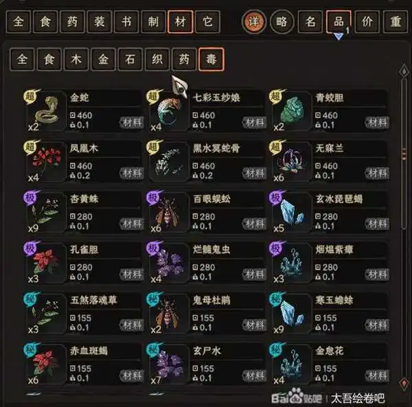 我主要寻求的是,毒药铁玉木织6个纬度材料道具的获取。首先最高稀有度的资源包括10种,毒,药各一个,铁玉木织每种各两个。