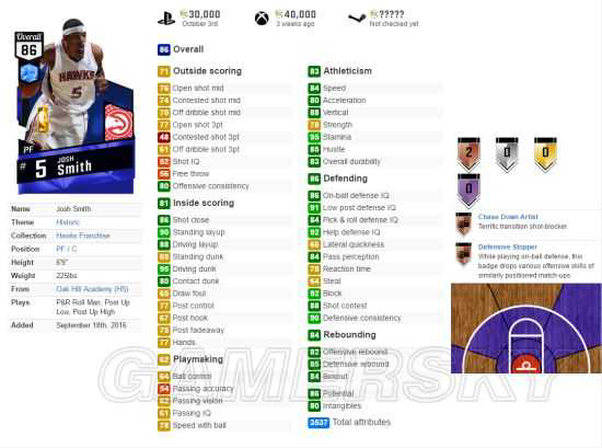 打法上这张卡没什么需要注意的,可以算是三分线内进攻小万花筒,有90的受干扰中距离可以作为24s接锅手的保障,XJBD都不怕。防守也最好手控,要不然会被突成狗