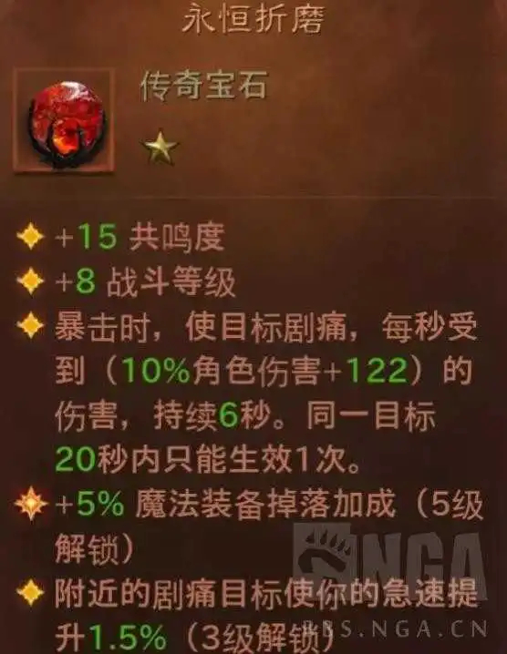 永恒折磨(特效:暴击时,使目标剧痛,每秒受到(10%角色伤害+122)的伤害,持续6秒。同一目标20秒内只能生效一次;附近的剧痛目标使你的急速提升1.5%(3级解锁))