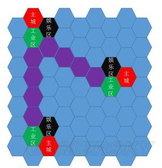 紫色方块表示距离!!!这样建城区的好处是什么呢?三个工业区互相覆盖三个主城!!!