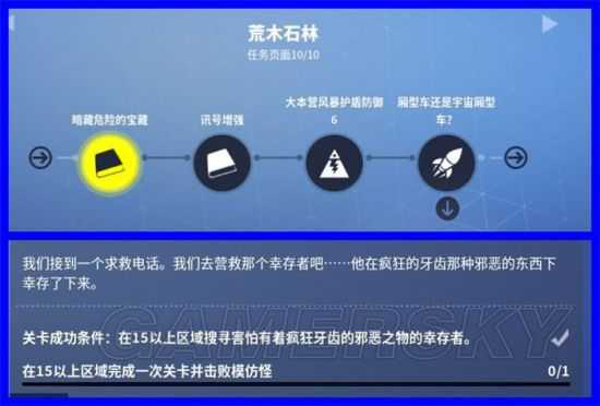 下面敲重点,这个任务看似十分简单,因为幸存者在游戏地图里会有图标显示,很容易可以寻找了,其次15以上区域完成一次关卡,这个难度也很简单,拉几个好友一起开黑,分分钟的事情,重点是最后那五个字“击败模仿怪”,卡住了一大批要拯救世界的萌新。