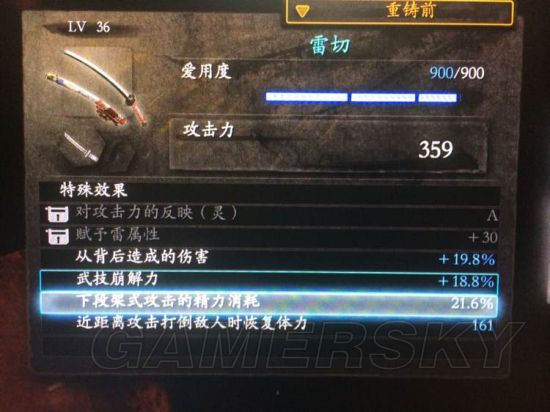 所以,我重铸的顺序是先5项一起重铸,看头5次左右能不能出个增加伤害的属性,出了就去神社储存,继续四项重铸,目标是加背部伤害貌,然后到了三项重铸的话,只有击杀回体力,近距离减精力消耗这两个看的上,但是要说的是,以上所说的两个属性在3项重铸中一起出现的几率极低,起码我没遇见过,所以最好就是在5项或4项重铸的时候出个加伤害的顺带以上所说的其中一个,最好多个…(那是不可能),最后只剩一项重铸的时候,基本都是没什么特别的属性,随便一个的了。总之,多项重铸出极品属性越高,没少一项就天和地的区别。