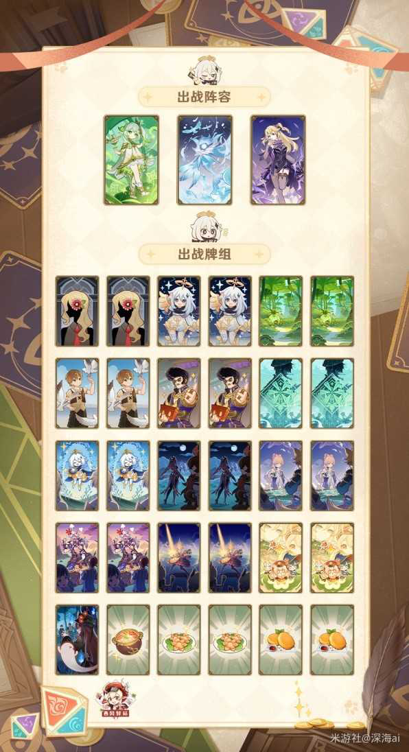 阿园轴及相关卡牌也是很推荐携带的。慢速卡组在阿园上手后能更快的运转资源和回复队伍状态,并且因为3.7的更新,现在我们也有更多的场地牌可以挑选,搭配阿圆可以进一步提高卡组上限(当然,如果不喜欢阿园轴也可以换成更多的充能、食物、或者再带一张重攻击。)