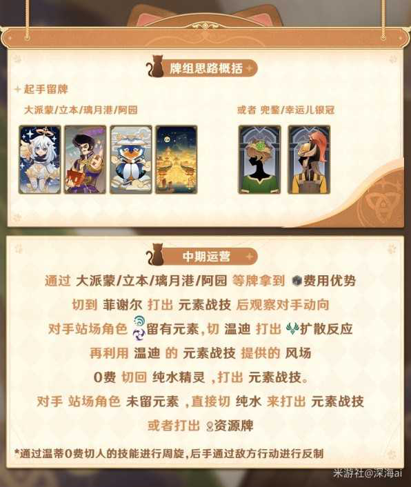 如果对手并未选择有元素的角色停场,则可以选择切到纯水来打出元素战技,或者分配费用给蓄爆牌或者阿园轴之类的资源牌。