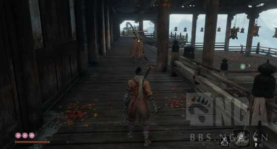 首先,从后门出去,然后跑过去杀右边走廊的蓑衣兵。