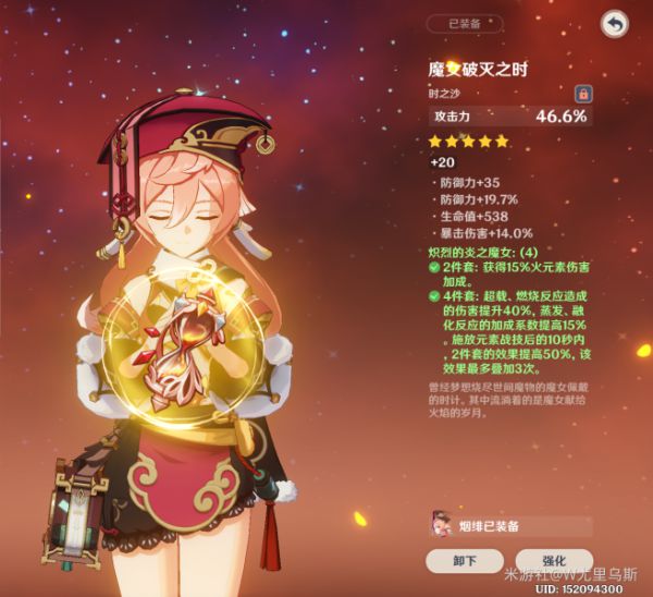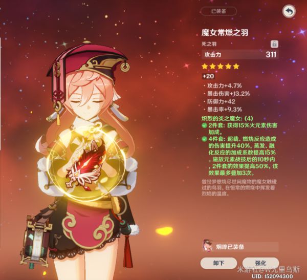 参考面板:攻击力1600+,暴击60+,暴伤120+,火伤85.6%(不带魔女套的话70.6%)