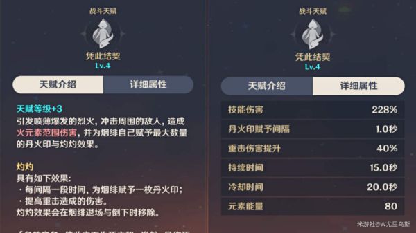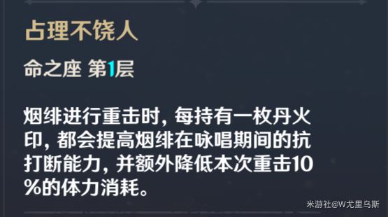 普攻命中敌人获得一枚丹火印:上限为3枚(6命会在多加一枚),每枚丹火印能为烟绯降低15%的体力消耗包括:攀爬,冲刺,游泳,重击等体力消耗。重击是烟绯主要输出手段,重击消耗所有丹火印,根据释放重击消耗的丹火印数量,可以不同程度地提升重击伤害和范围。