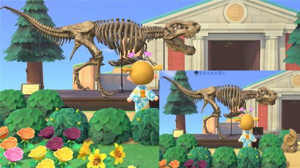 博物馆中还陈列着不少恐龙化石,这些恐龙化石其实都有两个型态,我们靠近以后按“A”键就可以看到。比如:下面的暴龙化石,它的嘴巴其实可以张开和关闭。