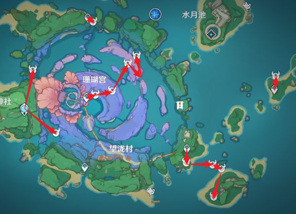 多数位于水面之上,携带霄宫等远程角色可较大提升刷取效率。