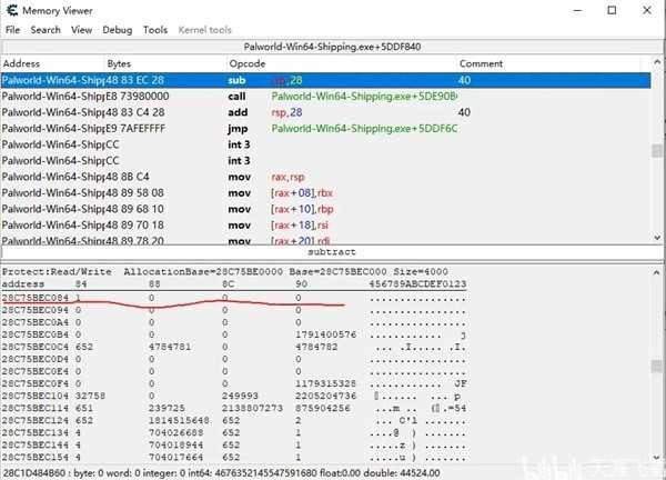 打开内存地址并且修改显示类型后如下,实际上红线部分是这个格子的物品数量,需要往上才能找到稀有度。