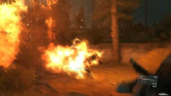 逃离火男的追杀之后往楼下走,这里遇到敌人,先躲在墙后面,绷带男会把他撂倒再给你一把枪。接着瞄准后面的灭火器开枪,扑灭火势。接下来就是一连串的枪战,包括室内和室外,当然室外是可以不被发现通过的,强上当然也行。前进到靠近大门的时候机会触发剧情。