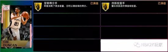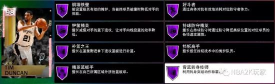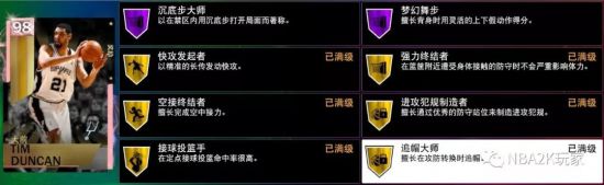 粉钻邓肯拥有八枚紫色名人堂徽章以及十枚金色徽章,内线攻防徽章中大部分实用的都给到了名人堂级,比如持球防守、铜墙铁壁、护框精英等;补充徽章方面可以选择中距离神射手、隔扣达人以及远距离神射手等。